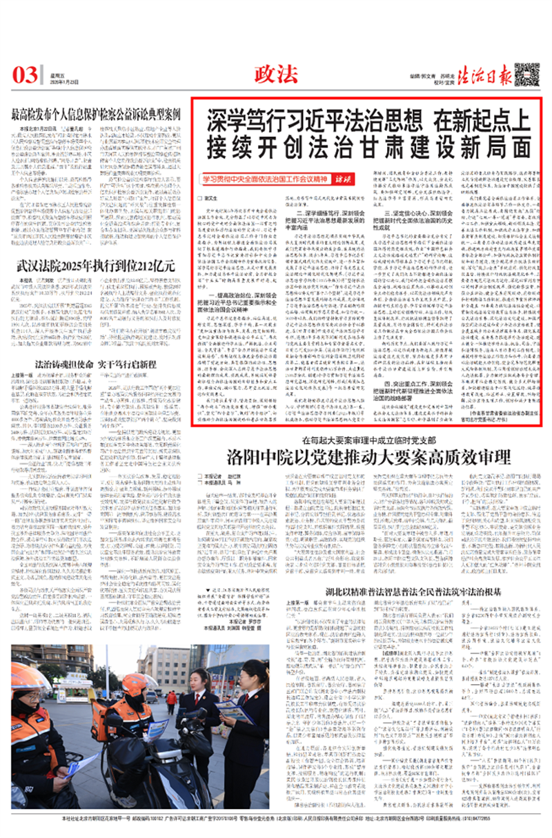 党中央时隔5年再次召开中央全面依法治国工作会议,充分彰显了以习近平同志为核心的党中央对全面依法治国一以贯之的高度重视和厉行法治的坚定决心。习近平总书记对全面依法治国工作专门作出重要指示,为新征程上推进全面依法治国提供了根本遵循和行动指南。我们要把学习贯彻习近平总书记重要指示和中央全面依法治国工作会议精神作为重要政治任务,深学笃行习近平法治思想,立足甘肃发展实际,加力建设高水平法治甘肃,全力护航全省“十五五”时期高质量发展开好局、起好步。